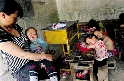 穿着开裆裤的孩子,躺在一位女人怀里。女人摇晃着哄他入睡,孩子脸上还挂着因瞌睡闹人的表情--这看似温馨的一幕,不是发生在某个家庭里,而是在一个山村小学的教室里。